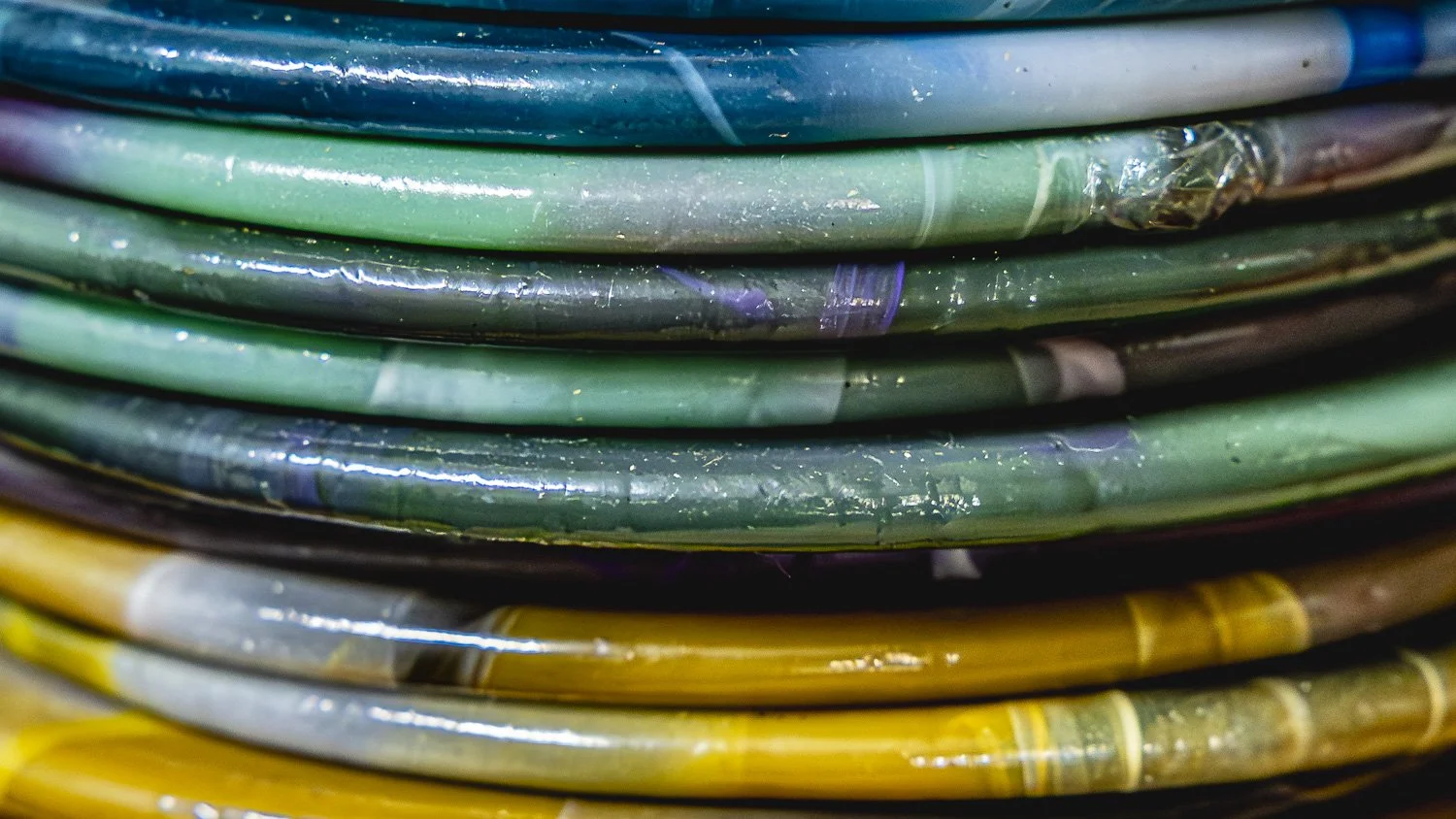 The plastic – low density polyethylene (LDPE) – includes the clear plastic wrappings from local shops and plastic carrier bags which add colour to the finished works. Once cleaned, the plastic is melted to form a dough, kneaded, blended with other colours, re-melted, re-kneaded, blended and rolled before being finally mixed together in a physically demanding process. Finally, it is pressed, cut, sanded and polished to create the marble-like finish of the final products.